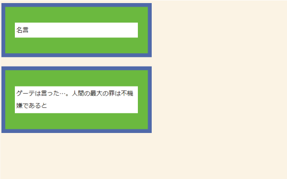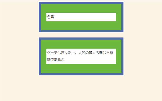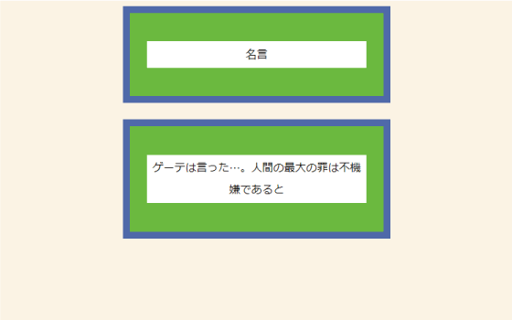boxが中央に配置されました。文字列も中央に配置されたかのように見えますが、「名言」は左寄せで表示されているので文字列も中央揃えにしたいと思います。
